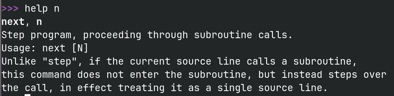 n这个命令是next命令的缩写- 功能是步过一行,不会进入函数调用中