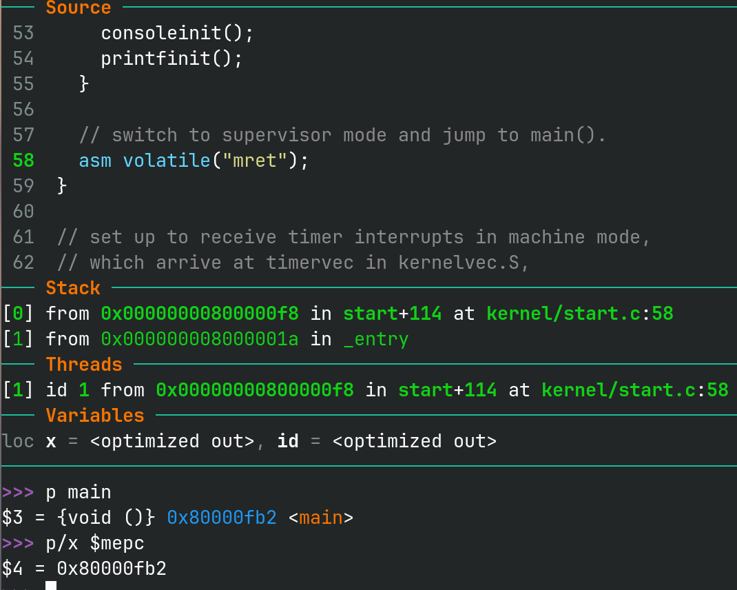 接下来我们将会演示使用 gdb 以及 gdb-dashboard 调试 xv6 的启动流程,请同学们跟着实验步骤亲自动手调试并结合 xv6 代码进行思考。