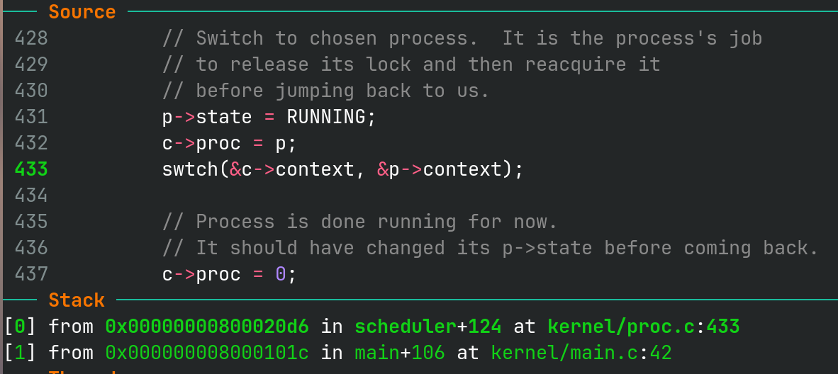swtch函数是汇编语言函数,因此s无法直接进入,需要使用si直到步入跳转指令才能进入该函数调用。之后遇到汇编函数时都需要使用