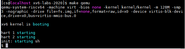 Step2 当可以看到“init: starting sh”的字样表示xv6已经正常启动,此时在“$”提示符后可输入xv6支持的shell命令。