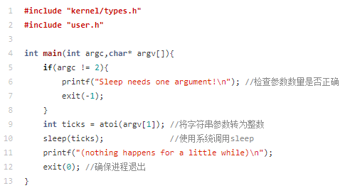 为帮助同学们理解xv6用户程序的编写方法,我们提供了一个sleep用户程序示例,你需要理解其代码并成功将其运行: