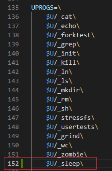 Step2 . 由于sleep.c为新增的用户程序文件,请在Makefile文件中找到UPROGS,在UPROGS上增加一行$U/_sleep: