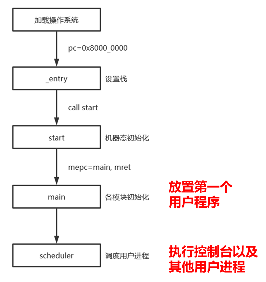 main函数地址写入特权级寄存器mepc,在start函数末尾mret指令会跳转到mepc寄存器所存的地址,也就是main函数,同时完成机器态特权级到内核态特权级的切换
