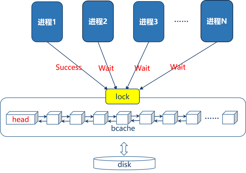 上图是bcache结构示意图。bcache.lock是自旋锁,用于表示 bcache 链表是否被锁住。b->lock是睡眠锁,用于表示缓存数据块buf是否被锁住。