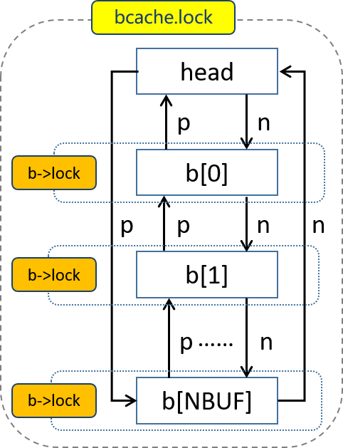 数据结构bcache(见kernel/bio.c)维护了一个由静态数组struct buf buf[NBUF]组成的双向链表,它以块为单位,每次读入或写出一个磁盘块,放到一个内存缓存块中(bcache.buf),同时自旋锁bcache.lock用于用户互斥访问。所有对缓存块的访问都是通过bcache.head引用链表来实现的,而不是buf数组。