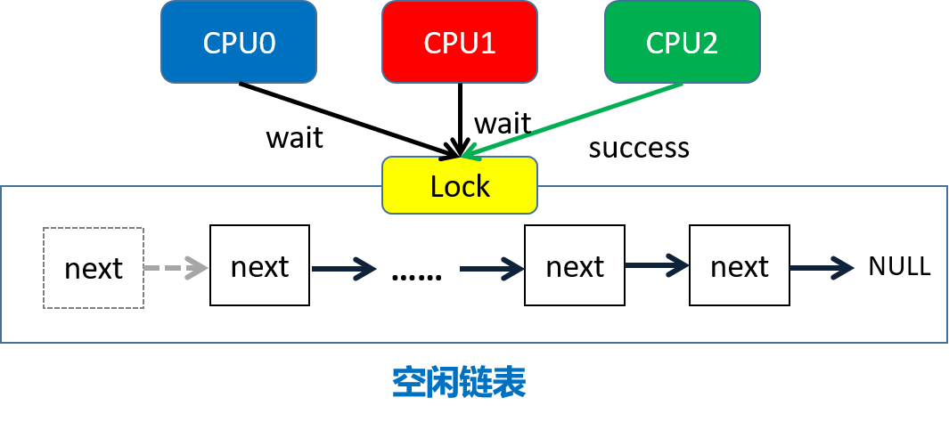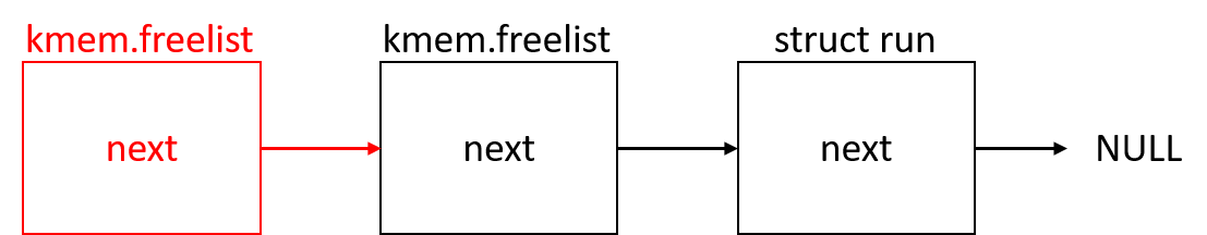 由于物理内存是在多进程之间共享的,所以不管是分配还是释放页面,每次操作kmem.freelist时都需要先申请kmem.lock,此后再进行内存页面的操作。