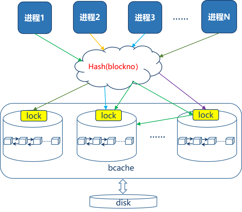 使用哈希桶,将各块块号blockno的某种散列值作为key对块进行分组,并为每个哈希桶分配一个专用的锁。通过哈希桶来代替链表,当要获取和释放缓存块时,只需要对某个哈希桶进行加锁,桶之间的操作就可以并行进行,提供并行性能。