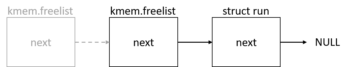 分配器的核心数据结构是由空闲物理页组成的链表freelist,这个空闲页链表将物理内存划分成4KB大小的页帧来管理,并使用 自旋锁 (spinlock)进行保护。每个空闲页在链表里都是struct run next指向下一个空闲物理页。