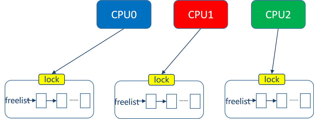 修改空闲内存链表就是freelist,现在我们要减少锁的争抢, 使每个CPU核使用独立的链表 ,而不是现在的共享链表。这样等分,就不会让所有的CPU争抢一个空闲区域。注意:每个空闲物理页只能存在于一个freelist中。