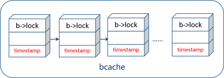 移除空闲缓存块列表(bcache.head)。使用 时间戳 作为判断缓存块最一次被访问的顺序的依据。