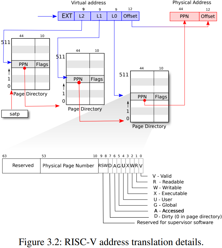 红色部分:页表项中有物理页帧号PPN,加上虚拟地址本身含有的 Offset 组成了物理地址,64位剩下的位数为保留位。注意, 虚实地址的Offset(低十二位)完全相同 ,不用翻译。
