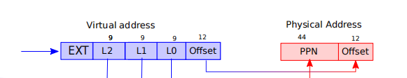 每个页表的大小都是4K,也就是一个页。页表有512个页目录项,每个目录项8 bytes,也就是64位。512个目录项需要9位的索引,因此 2.2.1 虚实地址 蓝色虚拟地址中的 L2, L1, L0 索引都是9位的。