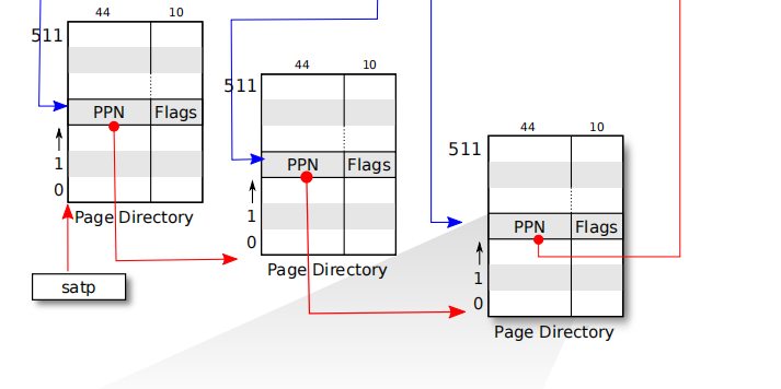 现在来看页目录项自身,可以大概分成两个部分:页帧号(PPN)和对应的标志位(Flags)(含有访问权限、访问记录等)。前者表示物理地址的页帧号,也就是 2.2.1 虚实地址 红色物理地址的PPN。但是每一级页表的目录项的意义都不同,具体如下:
