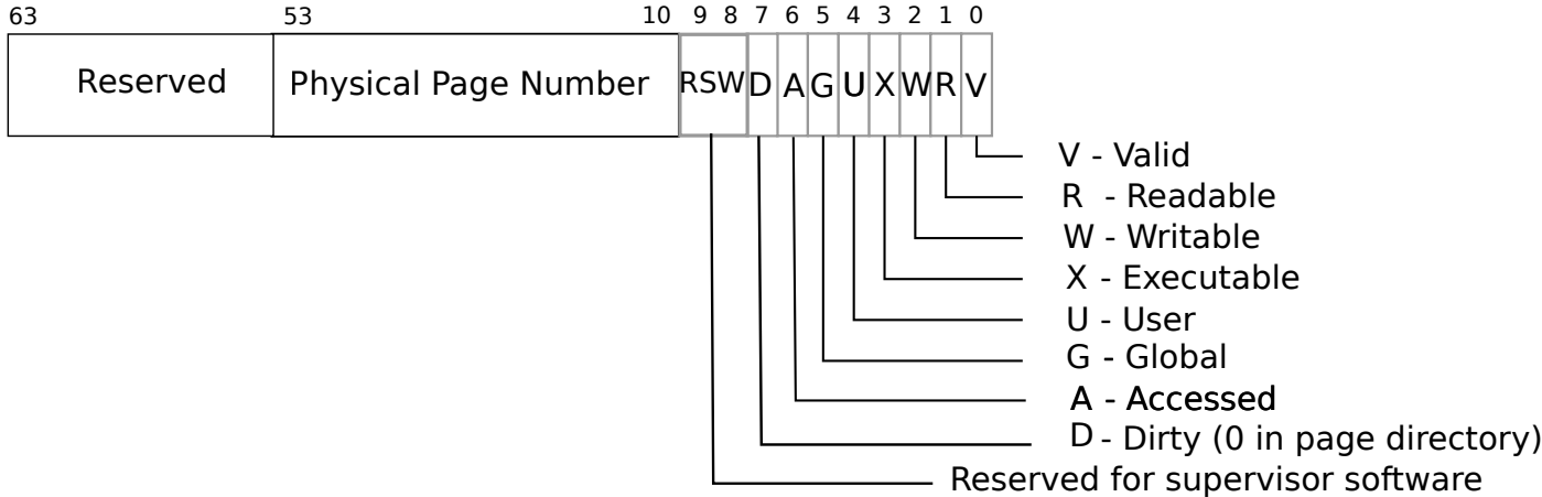 0位Valid:该页表项有效。对于叶子页表来说,这个位置为1说明虚拟地址有映射到物理地址,否则说明没有该映射。对于次页表来说,为1说明有对应的叶子页表,对于根页表说明有对应次页表。 - 第