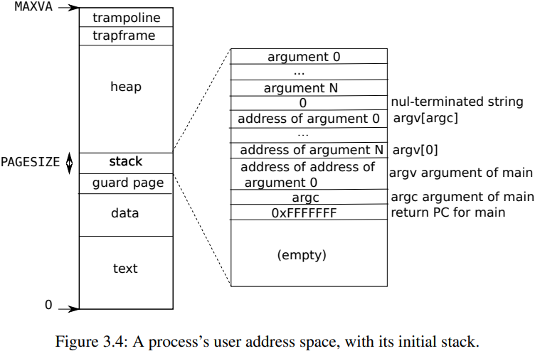 - stack:用户栈。xv6的用户栈只分配了一个页(PAGESIZE),放置在比堆更低的位置。通常操作系统会把用户栈放置在比堆更高的位置,这也是xv6和常见的操作系统做法不一样的地方。