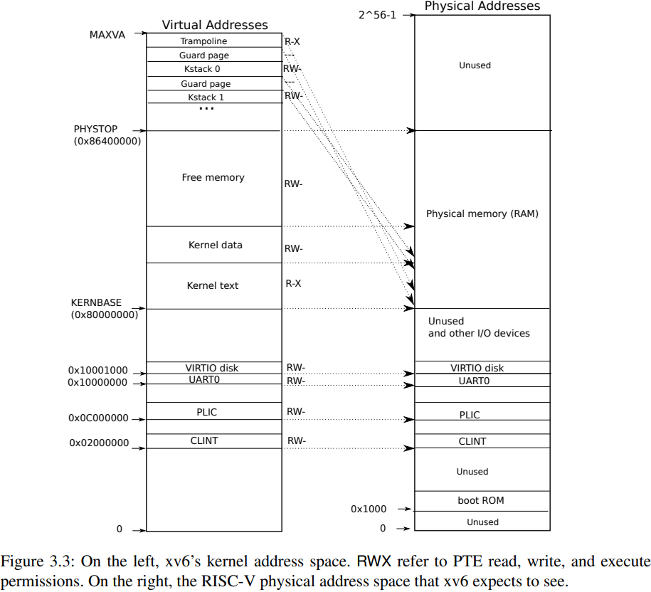 下图描述了如何将内核虚拟地址映射到物理地址,kernel/memlayout.h声明了xv6内核内存布局的常量。