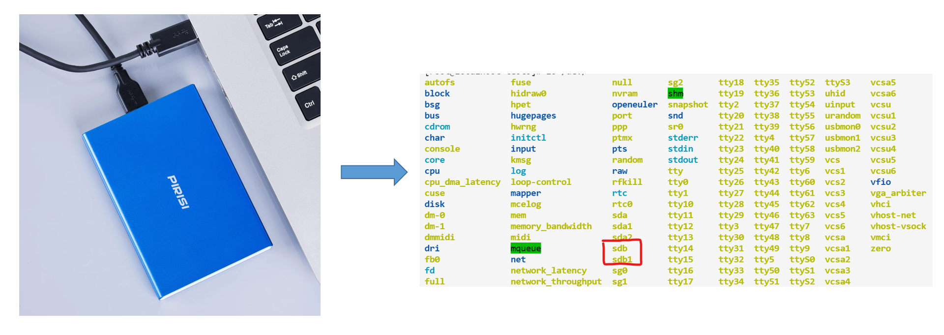 在Linux操作系统上,在主机插入某种存储设备时(如移动硬盘),通常只会在/dev目录下多一个设备表示,如上图所示。但是,通常我们无法直接访问这个存储设备(如移动硬盘)中的数据内容。