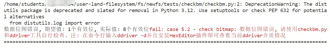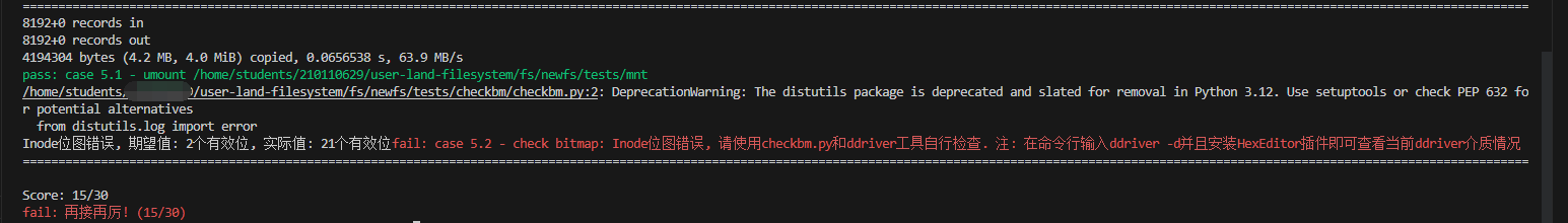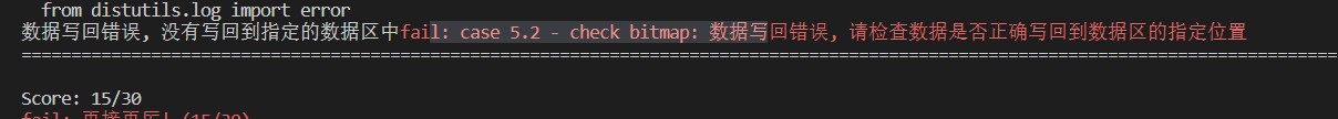 运行测评脚本时,在case 5.2 - check bitmap中显示,索引节点位图错误,数据位图错误,没有写回到数据区等。