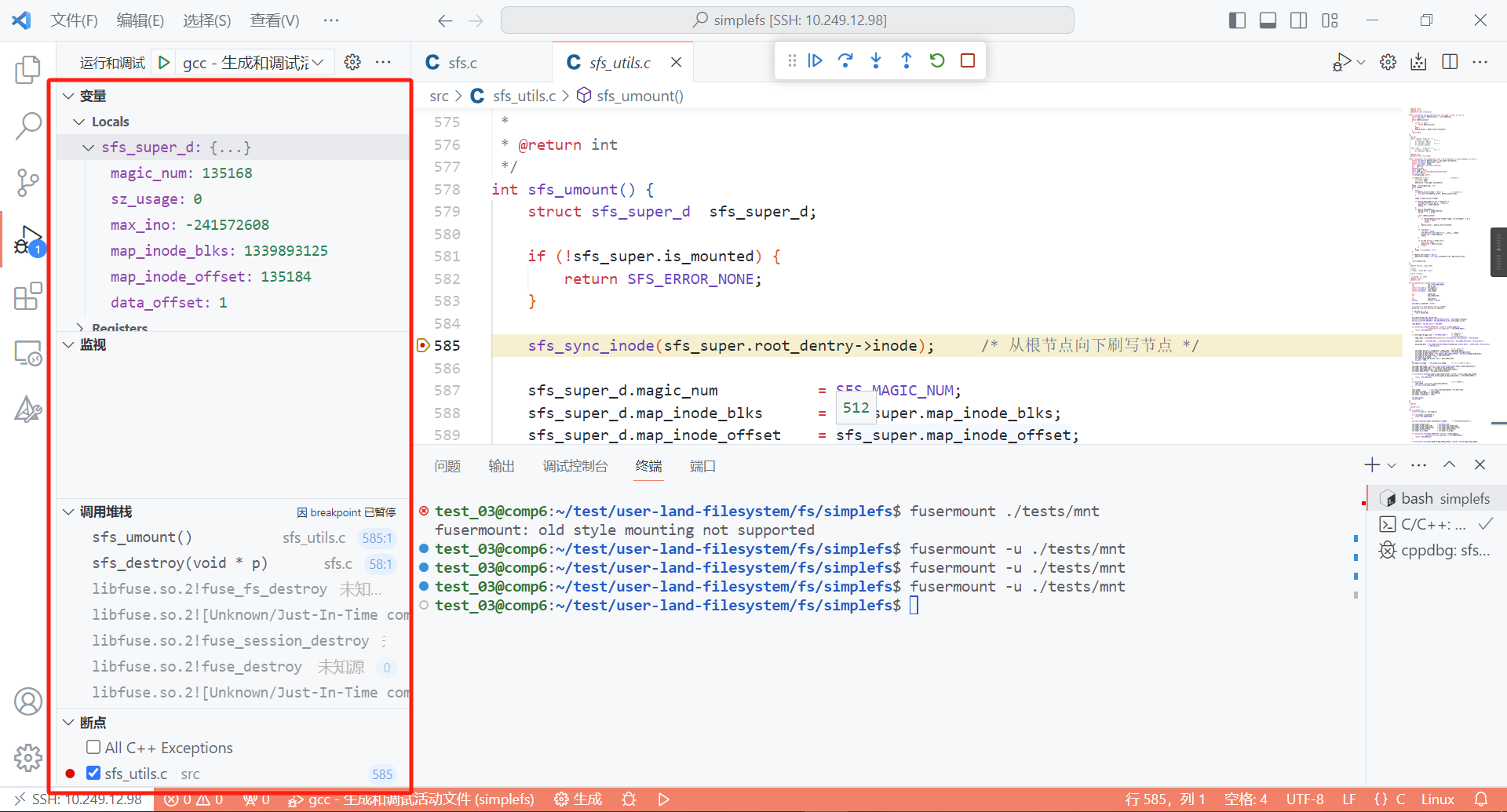 这种情况就是不正常的卸载文件系统,同学们直接ctrl + c或者在VSCode直接关掉程序,导致上次的挂载点仍被占用。我们需要完成 文件系统的卸载 ,释放上次占用的挂载点: