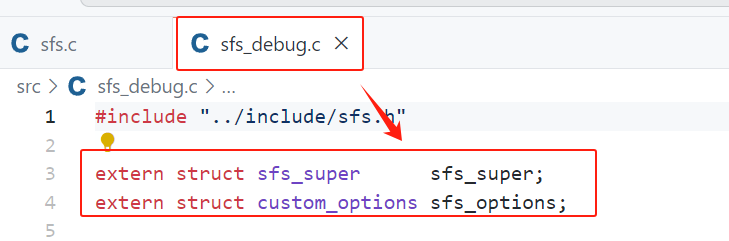 以simplefs为例,在sfs.c文件声明好全局变量,然后在其他需要使用的文件,如sfs_utils.c和sfs_debug.c使用extern关键字告诉编译器去别的文件找,这里直接使用。