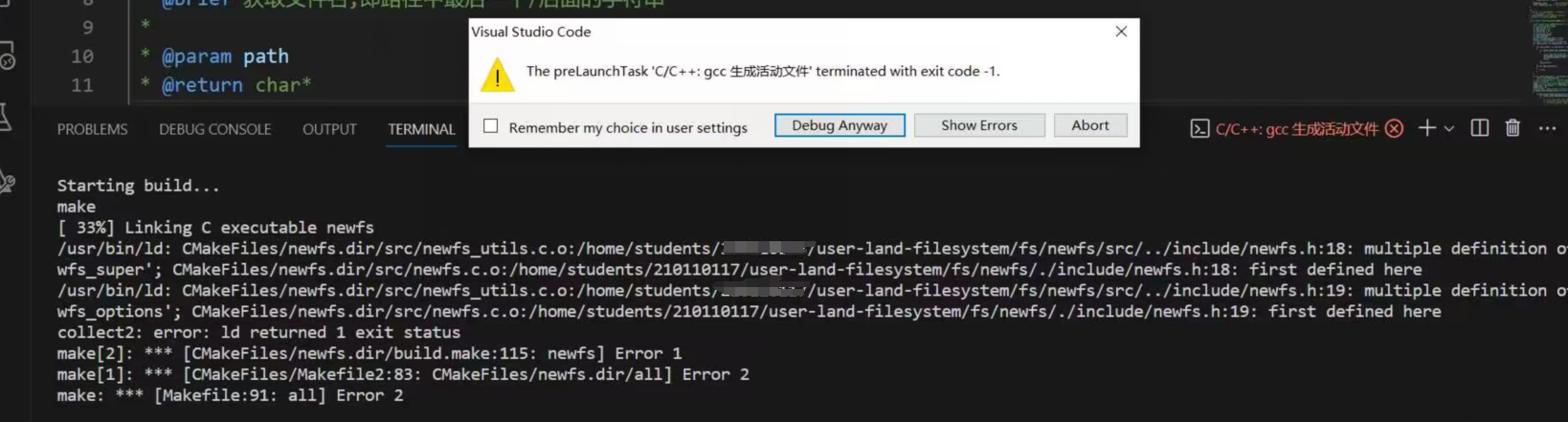可能是因为扩展安装不成功导致.json的解析有问题,请确认CMake、CMake Tools、C/C++三个扩展已成功安装到远程实验平台。如果还是无法解决,可以进入build目录,make手动编译可执行文件,之后点击“仍要调试”应该可以进行调试。也可在编译后手动输入launch.json中的命令(以任务一的demo为例,build/demo -f -d -s tests/mnt)进行挂载和手动测试,但是这样不能使用vscode的调试功能。