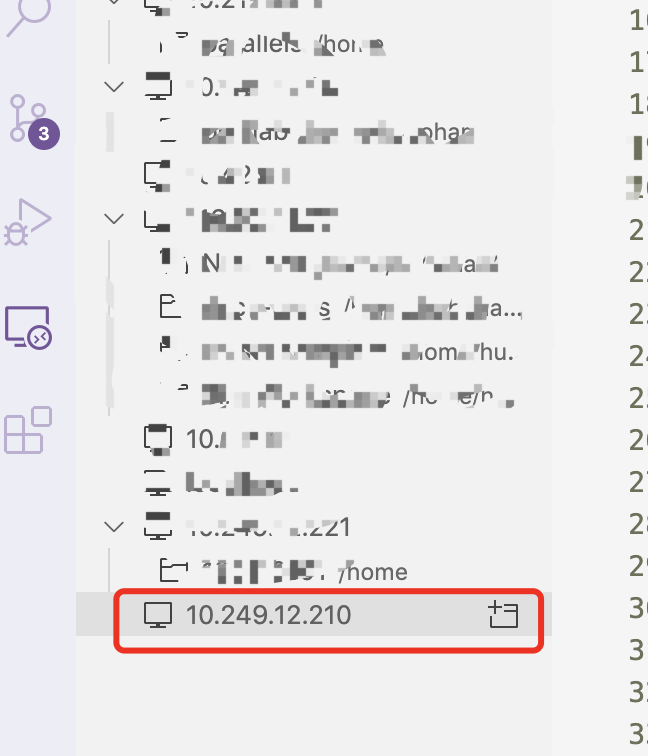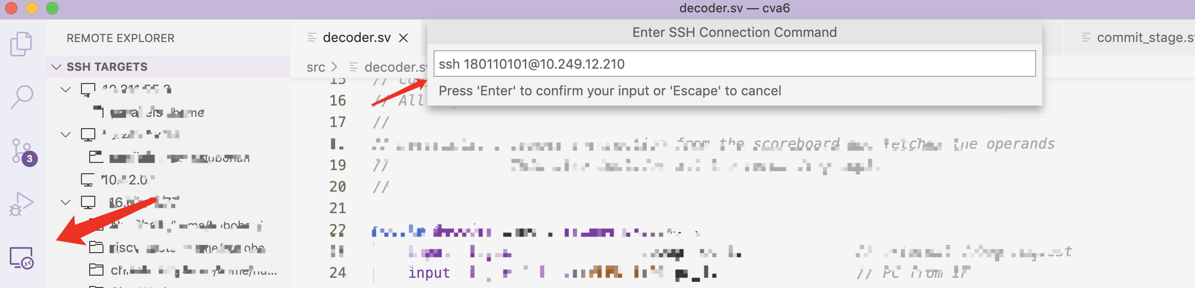 在左侧边栏的远程资源管理器工具栏中点击+号,在顶部输入ssh 你的用户名@IP地址 -p 端口号 命令并一路回车。