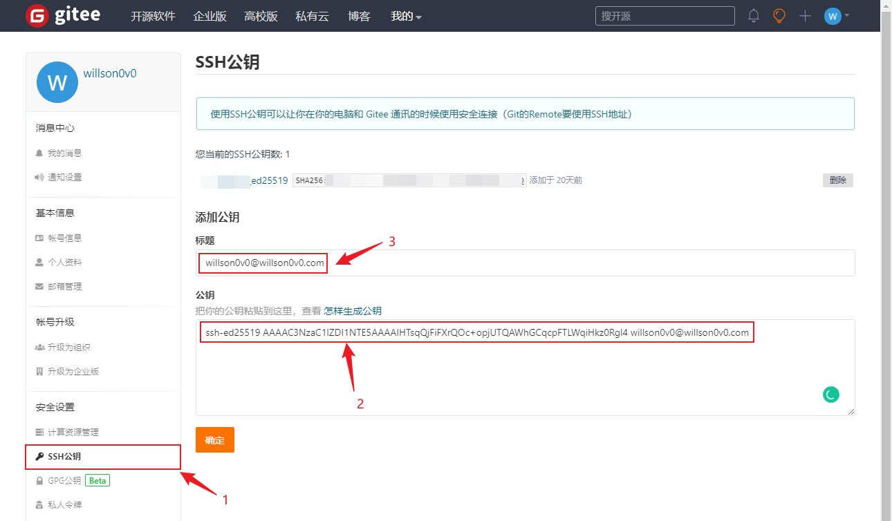 随后,点击左侧的ssh公钥,并将此前生成的 ssh公钥 内容拷贝进公钥区。你可以通过cat ~/.ssh/id_ed25519.pub从终端获得这个文件的内容。随后,你可以编辑这个公钥的标题。最后,点击最下方橙色的“确定”,即可完成公钥的添加。