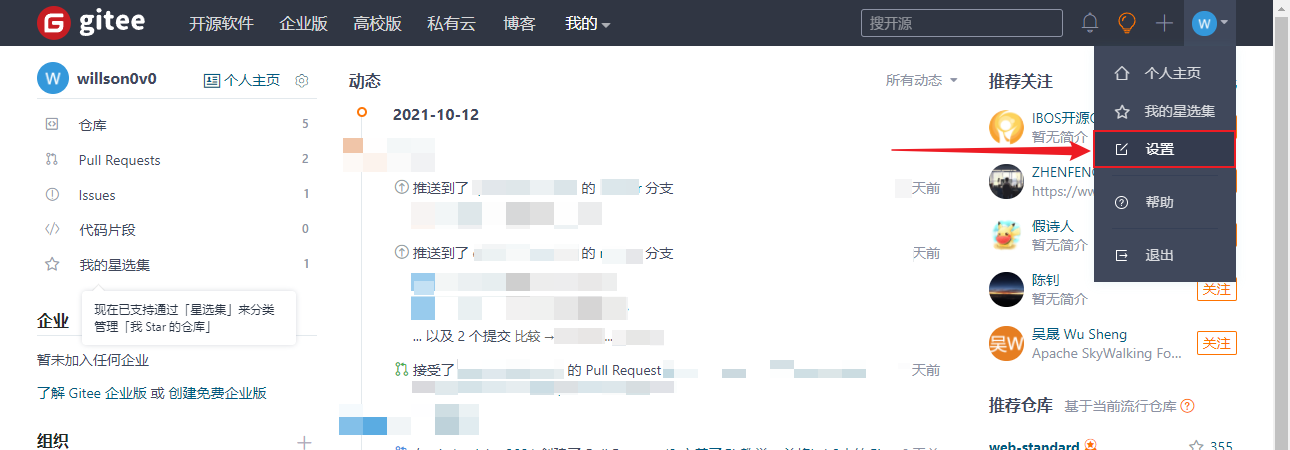 如果你要访问的远程仓库位于Gitee,那么你需要将你的 ssh公钥 部署到Gitee。首先,打开Gitee页面,登录,并点击左上角个人头像-设置: