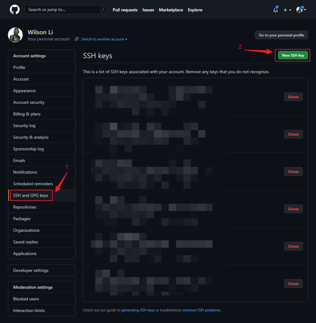 随后,点击左侧SSH and GPG keys,并点击右上角的New SSH key:
