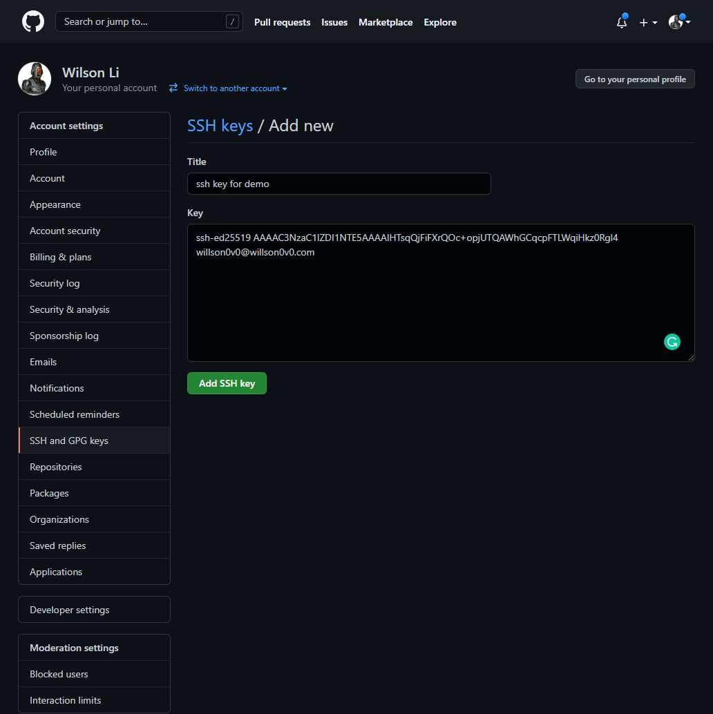 最后,输入SSH key的标题,将此前生成的 ssh公钥 内容拷贝进公钥区,并点击下方绿色Add SSH key即可。