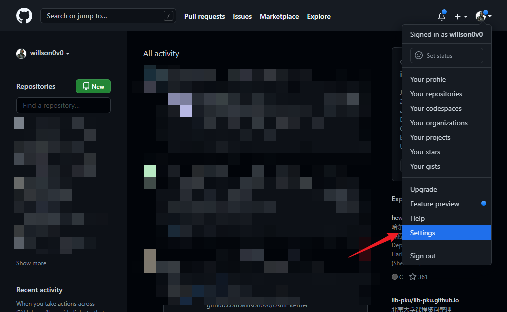 如果你要访问的远程仓库位于Github,那么你需要将你的 ssh公钥 部署到Gitee。首先,打开Github页面,登录,并点击左上角个人头像-Settings: