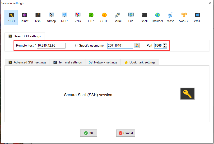 打开MobaXterm,单击打开工具Session(位于左上角)选择New sessions打开新建窗口,选择SSH,输入远程服务器的IP地址、登陆用户名及端口(默认是22,远程实验平台端口号是6666),点击OK。