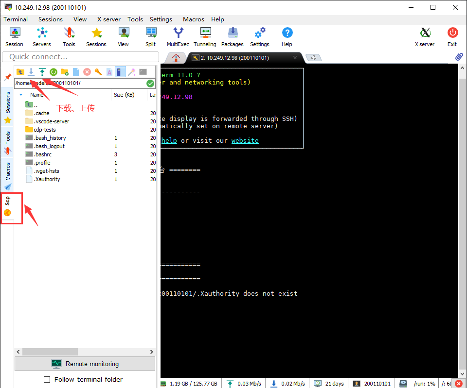 接下来,可以点击红色框框的按钮“Upload to current folder”或者“Download selected files”,在windows系统和虚拟机/远程实验平台之间上传或下载文件。