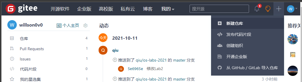 其中,远程仓库origin的地址(在此处显示为git@gitee.com:willson0v0/xv6-oslab24-hitsz.git)应该是是你自己的远程仓库地址,而远程仓库upstream的地址应该显示为本课程实验提供的远程仓库地址,即https://gitee.com/ftutorials/xv6-oslab24-hitsz.git。